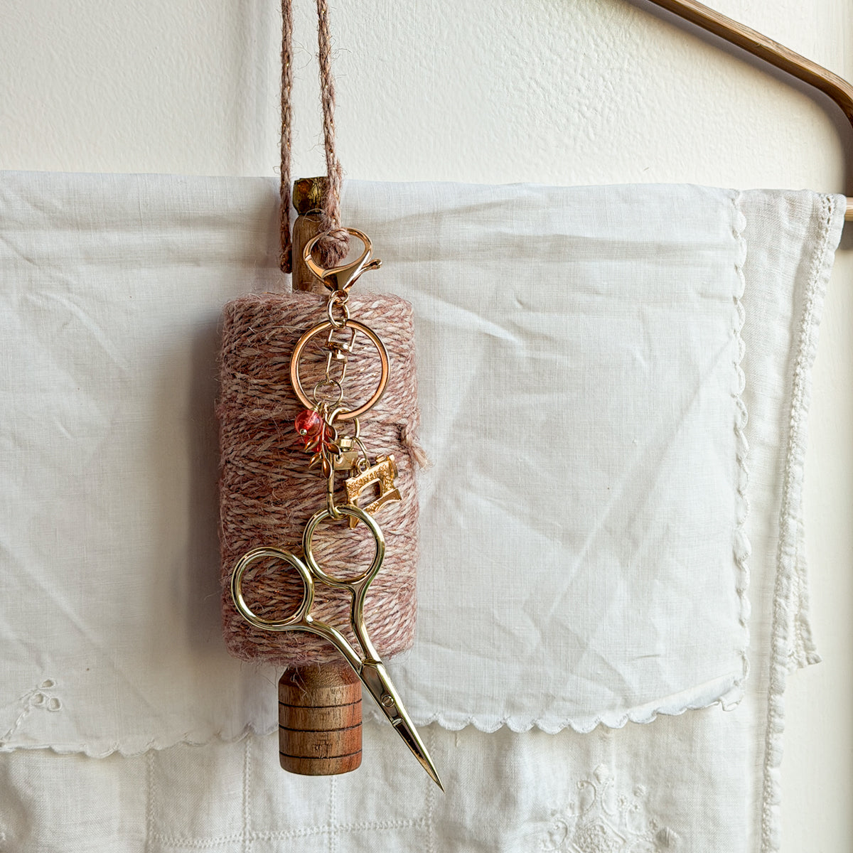 What sewist doesn’t like a large collection of scissors to use at home or even when traveling. Amy had traveling in mind when she made these clips with charms for these simple petite sewing scissors. They are made of stainless steel. They’re new, sharp, unused and perfect for clipping to a bag for easy access. Small enough to bring with you and lovely to display at home. These golden scissors are embellished with two “berries” and two charms as pictured.