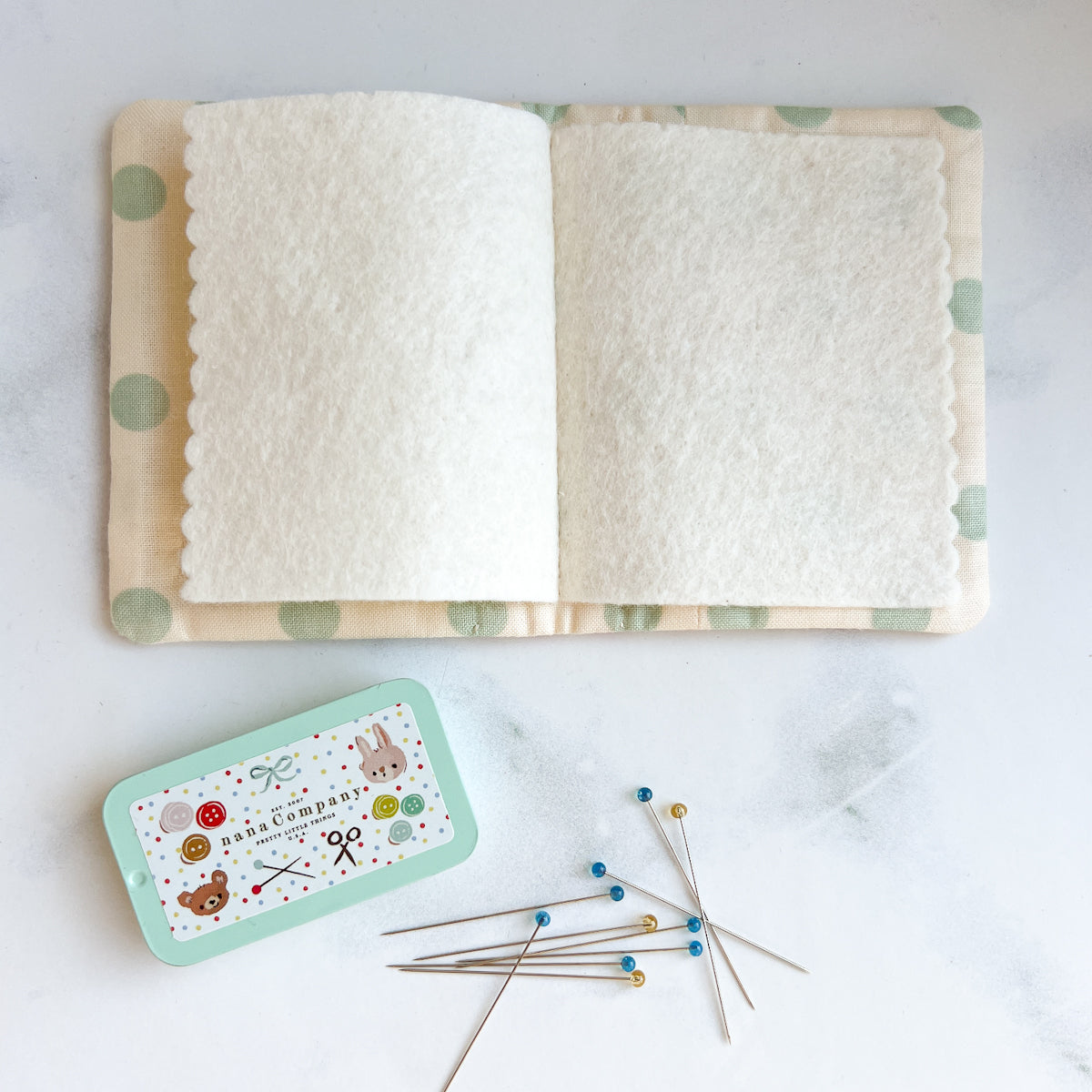 One of a kind! Made lovingly by hand by Amy Sinibaldi, using some of her favorite prints at the time she made it— paired with a cute adorable cross-stitched bear. This needlebook has two felt pages and comes filled with pins and needles to get you started; or simply remove and this needle book is ready to be stuck with your favorite pins and needles.