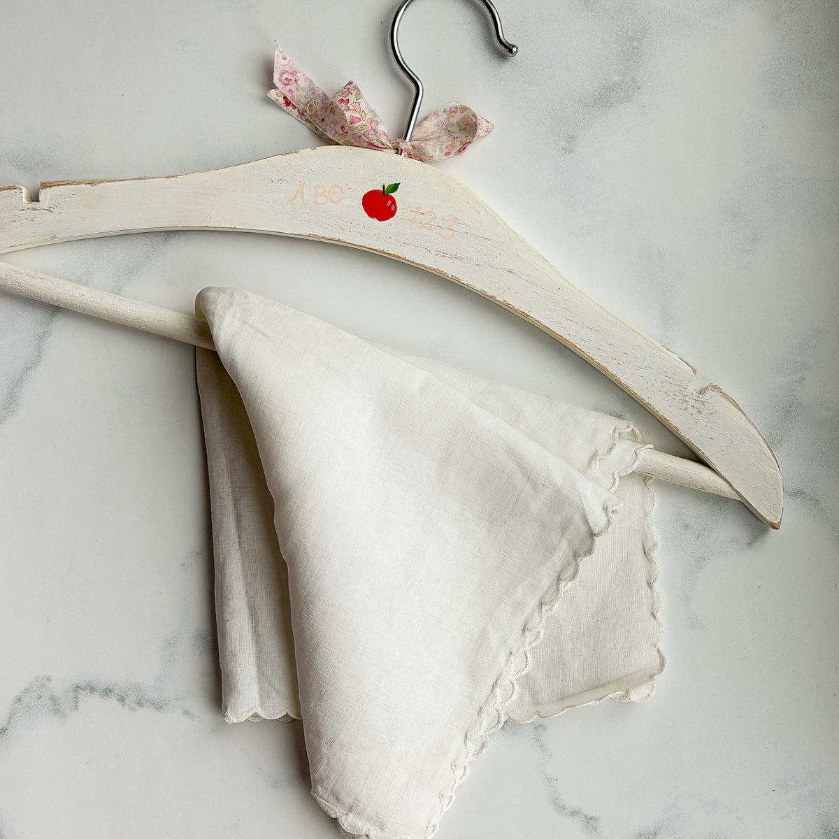 One of a kind wooden hand painted coat hanger by Amy Sinibaldi. This small coat hanger is one of a kind and evoking a sweet vintage look— it gives nod to a nostalgic time of charm and simplicity. *Please note, this hanger has a very small hook and will not fit a standard closet hanging bar. There are, of course, so many options in a home for hanging this coat hanger.