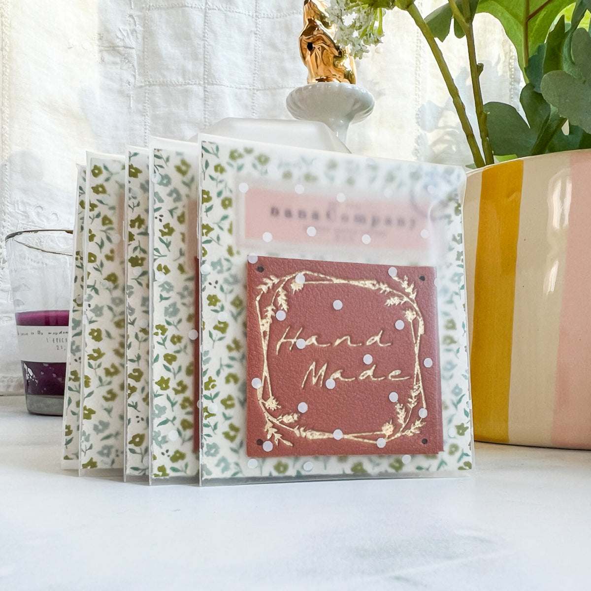 These gold-stamped sew-in leather-look labels featuring the words “Hand Made” will embellish any sewing, quilting, craft, or stitching projects.