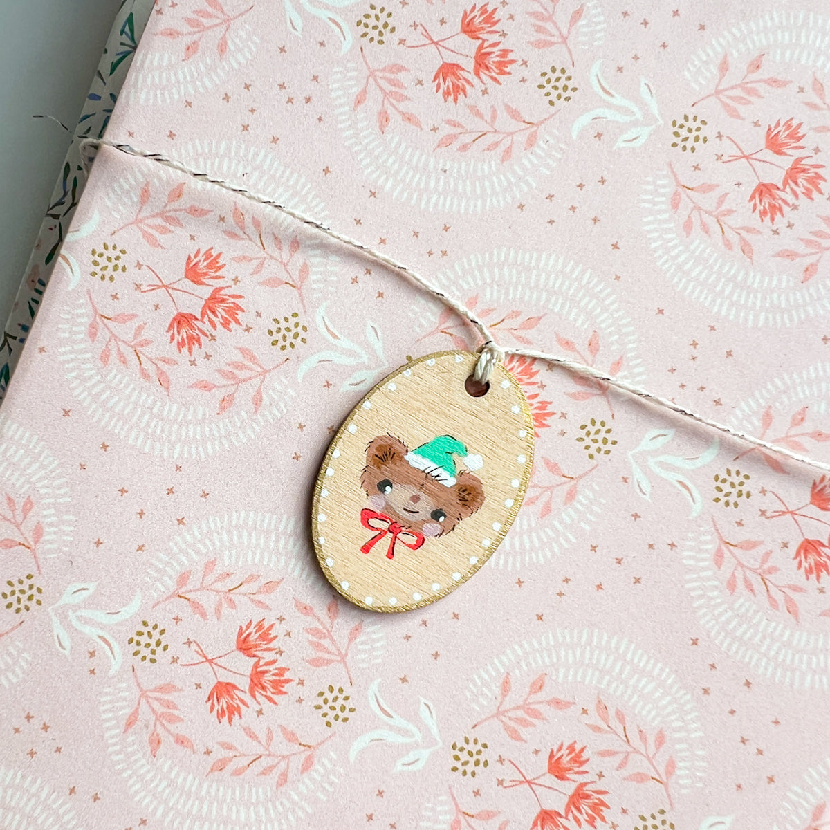 Holiday Christmas Bear Hand Painted Oval Wood Tag Gift Topper Ornament