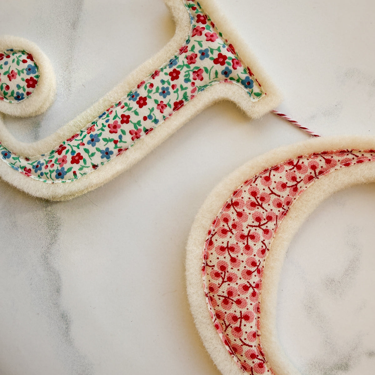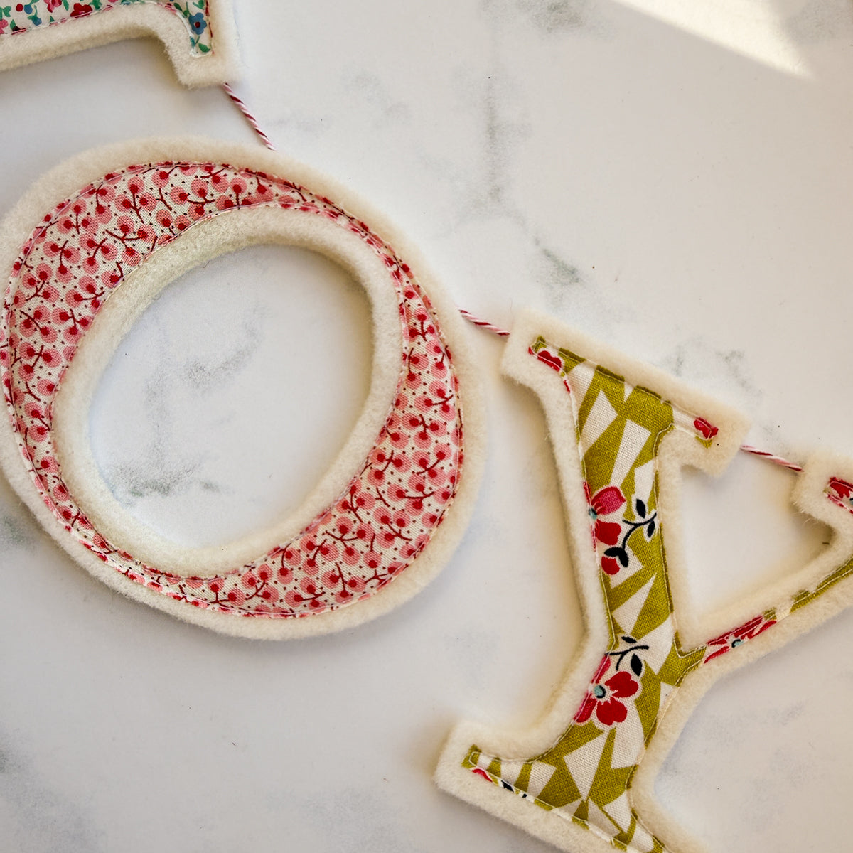 Who doesn’t need a little extra JOY this holiday Christmas season? Amy stitched bright festive fabric onto thick wool felt to make this garland… and a hanging twine is attached. Hang this petite garland anywhere for a little pop of sweetness!