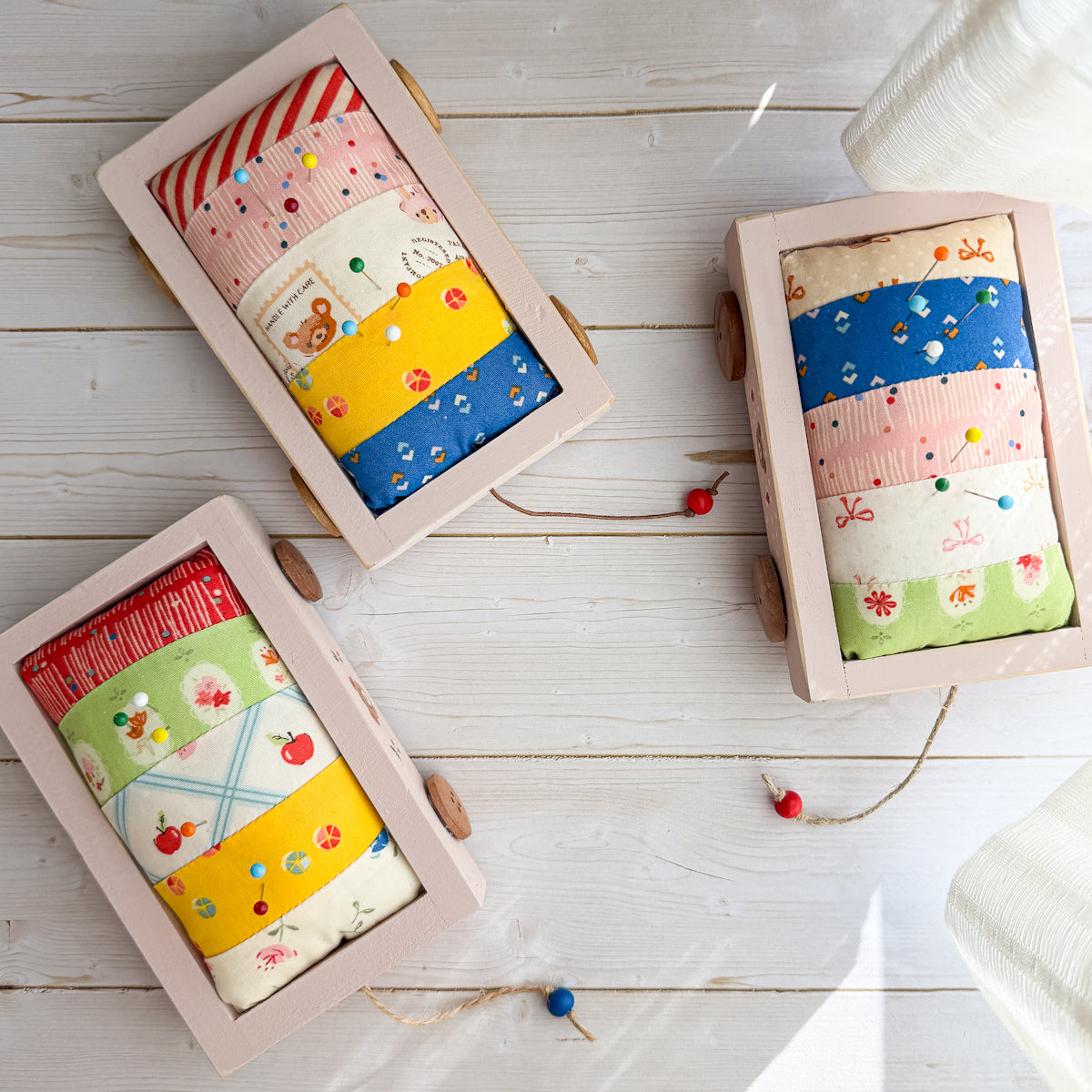 We’re so happy to introduce Amy’s new collection of fabrics MINIMO, in this cute pink hand-painted wood wagon pin cushion. The wagon has wood buttons and a little beaded pull-string. The pin cushion was made using strips of Amy’s new fabrics. This wagon features a bear with cherries. *Please note, these wagons are not toys and are not meant to be played with… pins are included.